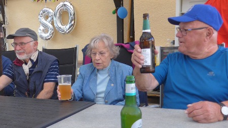 Helmut hat zu seinem 80. Geburtstag die Sänger nach Hause eingeladen und begrüßt seine Gäste.