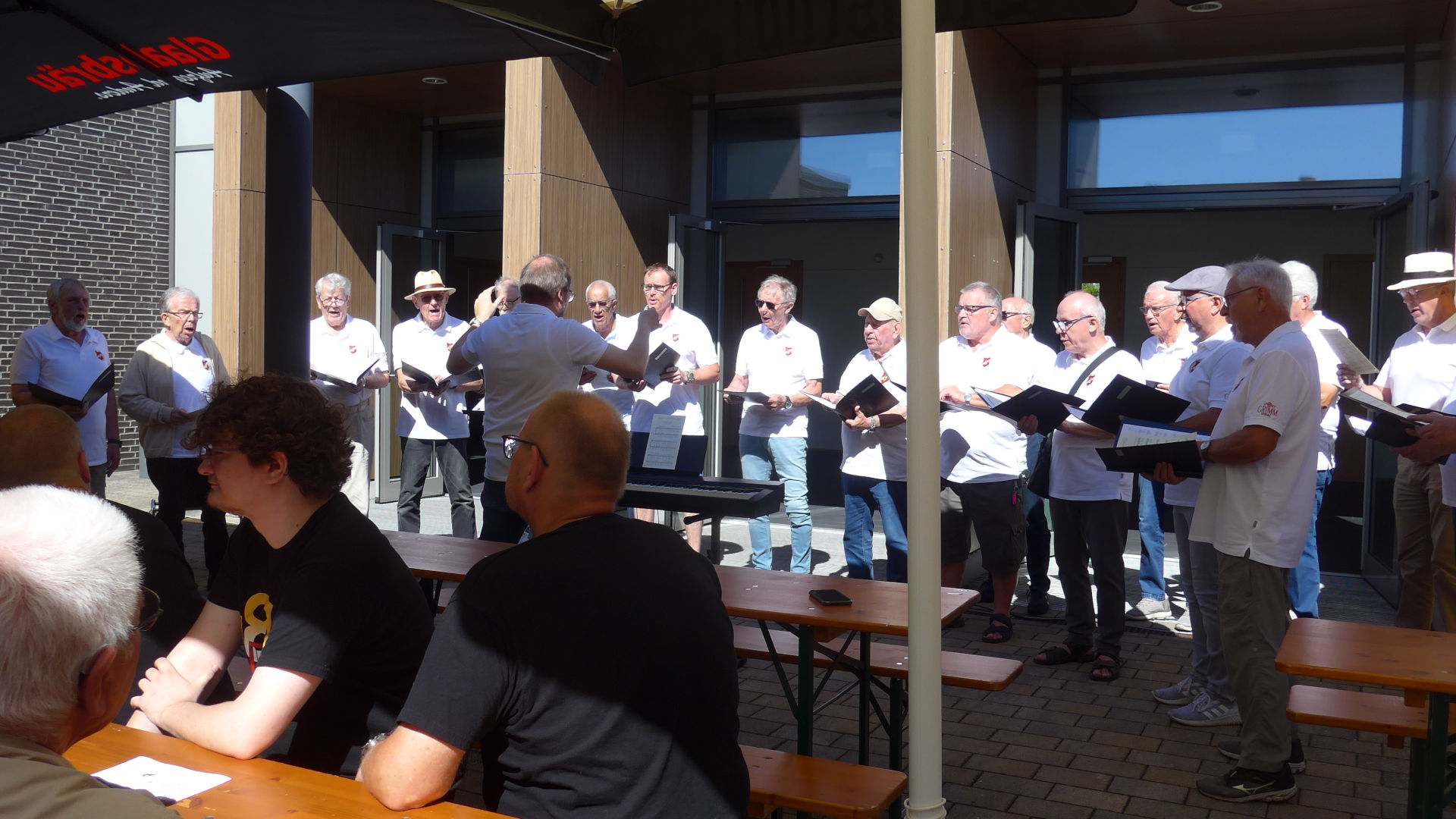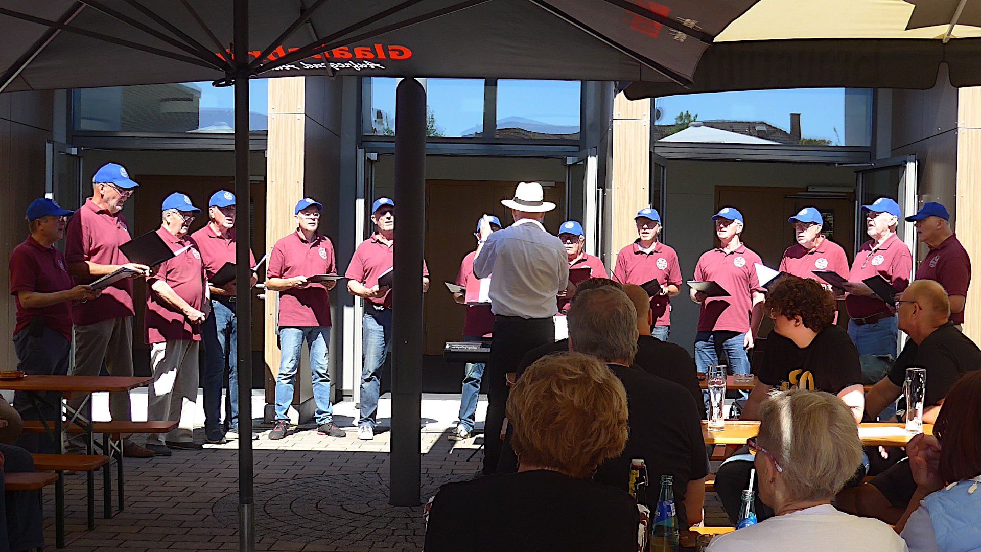 Unser Dirigent, Andreas Mohrhard, kommt direkt vom Auftritt beim Brunnenfest Altheim und beginnt gleich mit dem Einsingen. Während wir uns Einsingen läuft der Auftritt des MGV Münster.