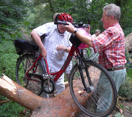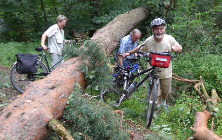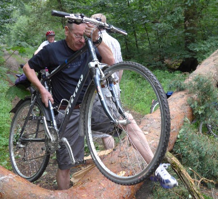 Die erste Etappe der Fahrradtour führte zum Spiessfeld und einer kleinen Erholungsrast. Dann führte der Weg über die Darmstädter Landstrasse zum Messeler Weg. Dort war im Gewittersturm eine große Fichte umgeknickt worden und versperrte die Weiterfahrt am Abzweig der Birnbäumchesschneise. Klaus wuchtet sein Fahrrad über den Baumstamm.