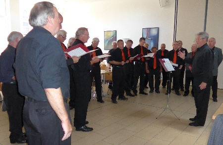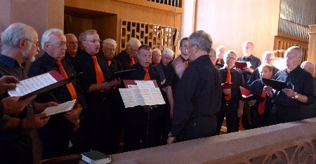 Die Männersänger singen sich unter Leitung von Manfred im Pater-Delp-Haus ein.