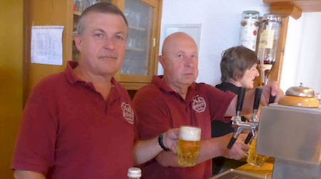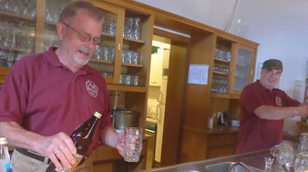 Reiner und Heini beim Getränkeausschank und beim Bierzapfen.