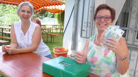 Monika zeigt, dass das Wechselgeld in der Grillkasse noch überwiegt.