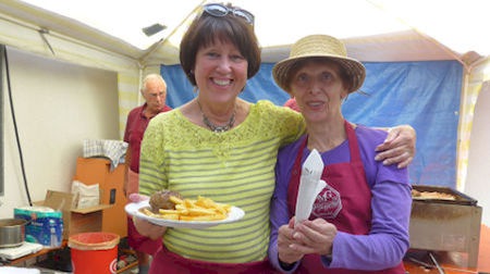 Waltraud und Annemarie bedienen die Gäste mit den Grillwaren.