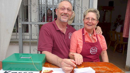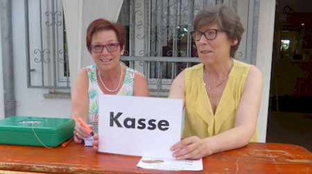Neben Monika ist nun auch Edith an der Kasse für Grillwaren: Bratwurst, Fleischkäs und Frikadelle jeweils mit Brot oder Pommes.