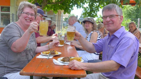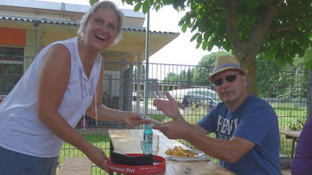 Jetzt sind die Helfer/innen noch allein auf dem Sommerfest anwesend und Klaus sorgt für das Feierabendbierchen.