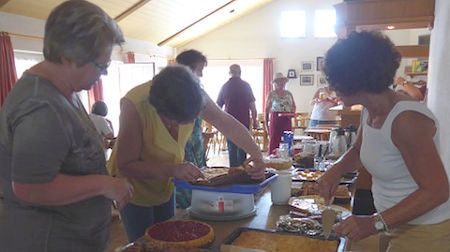 Eine grosse Anzahl leckerer Kuchen haben die aktiven und passiven Mitglieder gebacken. Stephanie und Edith füllen die Kuchentheke auf.