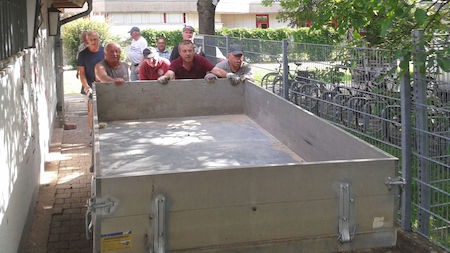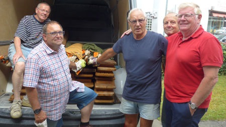Klaus und Klaus, Wolfgang, Albert und Dieter vor dem geladenen Wagen.