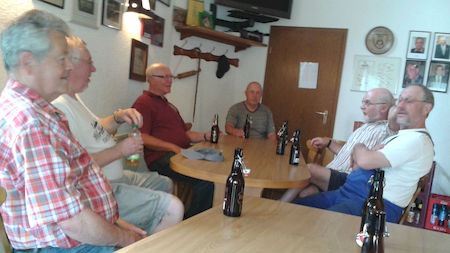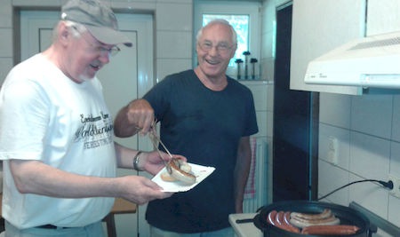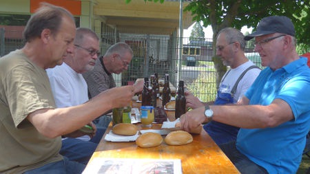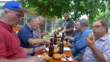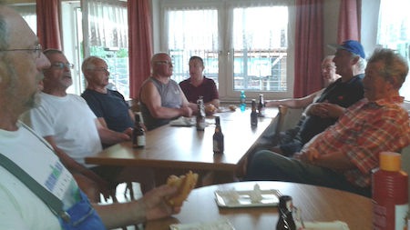 Angenehmer Höhepunkt beim Festaufbau ist immer das Frühstück; hier mit Albert, Gundolf, Klaus, Heinz und Wolfgang.