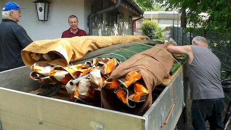 Der Wagen von Helmut ist gefüllt mit Zeltgarnituren und Sonnenschirmen.