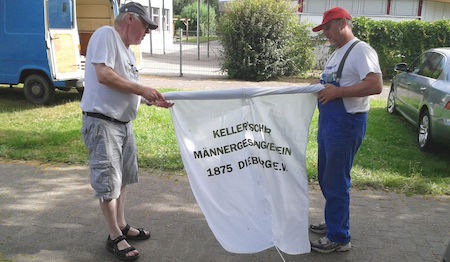 Günter und Heinz wickeln die Kellersche Fahne ein.