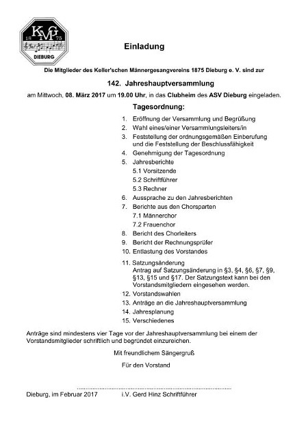 Die bereits in der Vereinszeitung verteilte Einladung zur 142. Jahreshauptversammlung wird um den Tagesordnungspunkt "Satzungsänderung" erweitert.