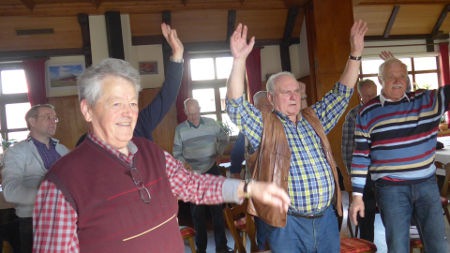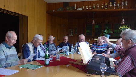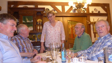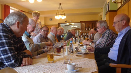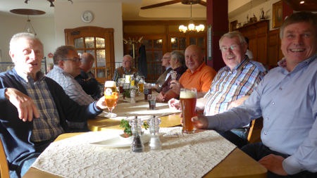 Die gesellige Runde hat manigfaltige Gesprächsthemen ergänzt von fröhlichem Gesang beliebter Melodien aus dem Liederheft; das gefällt auch der Wirtin, Fr. Klein; Sie spendiert eine Runde! Es wurde ein langer gemütlicher Abend.