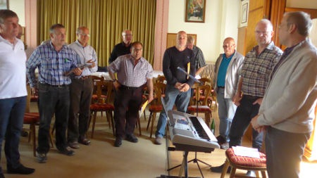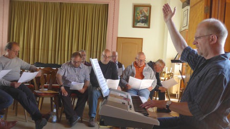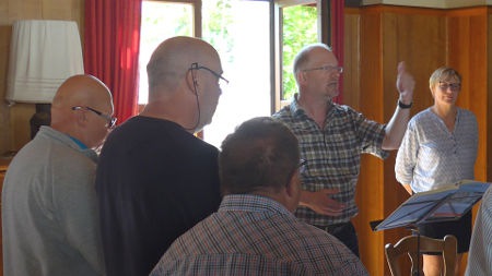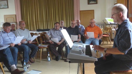 Die Tenöre, hier Tenor 2, proben separat mit Manfred "Machet die Tore weit".
