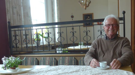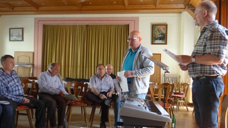 Heini, Chorsprecher der Männersänger, begrüßt seine Sänger und den Dirigenten.