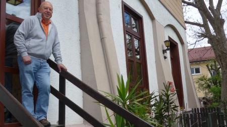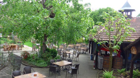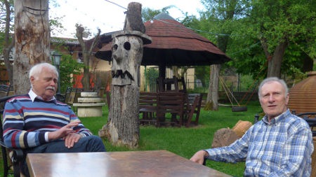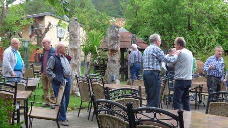 Franz und Gerhard plaudern entspannt im Biergarten vor dem Holzkobold.
