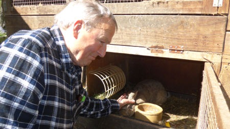 Paul, ein Freund von Has' und Katz, begrüßt ein stattliches Löffelexemplar, dem es sonntags ein großes Büschel frischen Grünschnitts mitbringt.