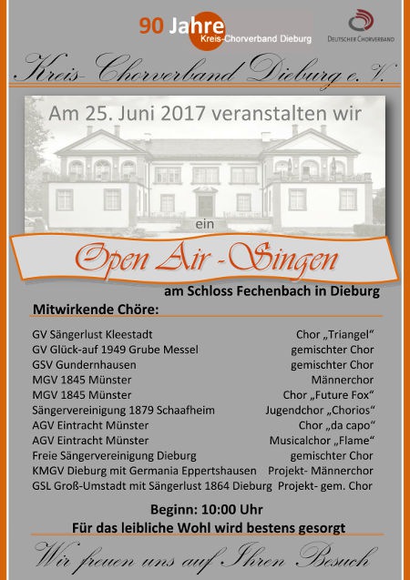 Die Dieburger Gesangvereine - Freie Sänger - Keller'scher Männergesangverein - Sängerlust hatten die Bitte des Kreis-Chorverbands Dieburg angenommen, das Open-Air Konzert anlässlich des 90-jährigen Jubiläums im Fechenbachpark auszurichten.