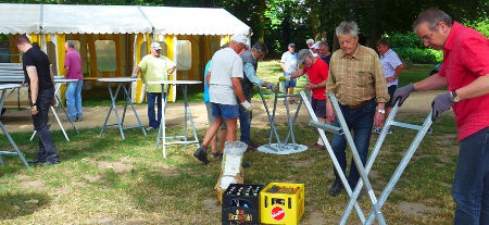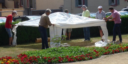 Innerhalb einer Stunde ist das Zelt der SL aufgebaut es folgen die Stehtische.