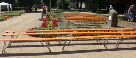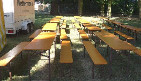 Neben dem Versorgungszelt sind die Tischgarnituren für die Imbissgäste.