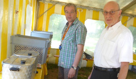 Die Zelteinrichtung beginnt mit Tische stellen, und dem Antransport von Geschirr, Kaffeemaschine, Kuchenkühlung...