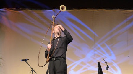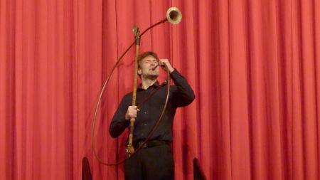 Hagen Pätzold stellt sein römisches Cornu vor und präsentiert aus antiken Quellen "Das Lied des Seikilos" aus dem 1. Jahrhundert vor Christus, das in Kleinasien in Stein gemeißelt vorgefunden wurde.