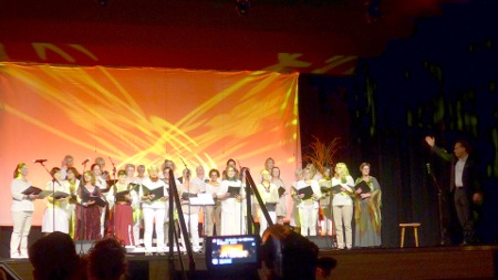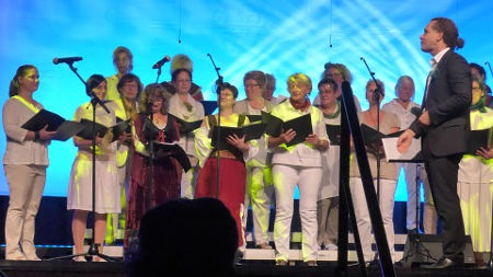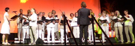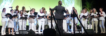 Dirigent, Rodrigo Affonso, weist auf die Sängerinnen von chorfavor hin - Klick ins Bild.
