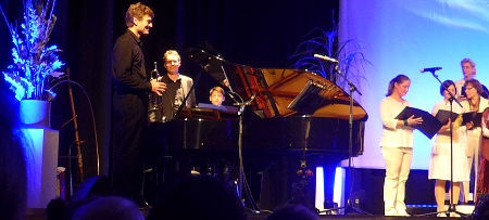 Trompeter, Hagen Pätzold und Pianist, Michael Roth mit Gehilfe für das Umblättern der Noten.