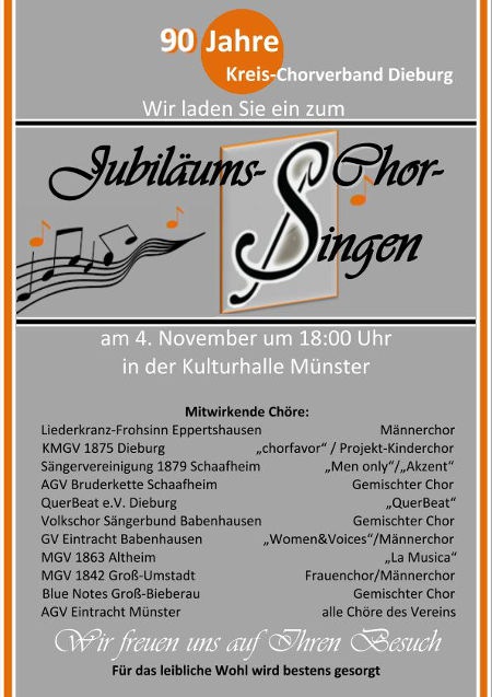 Am Samstag, 4.11.2017, richtete der Kreis-Chorverband-Dieburg ein Jubiläumskonzert in der Kulturhalle Münster aus; hier nahm auch der KMGV-Kinderprojektchor unter Leitung von Rodriguez Affonso teil. Der Kinderprojektchor war für das Konzert von chorfavor "Der Klang der Märchen" gegründet worden.