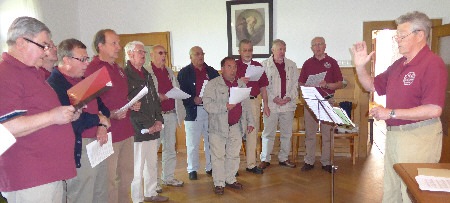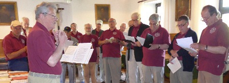 Die Männesänger singen sich mit Manfred im Refektorium des Klosters ein. Hier sind die Bässe.
