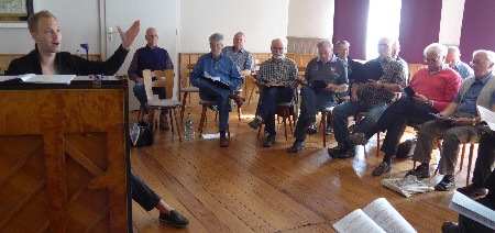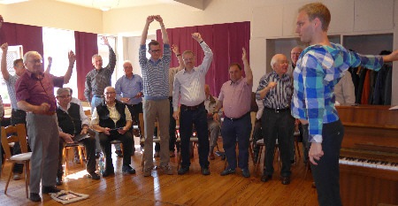 Dirk übernimmt das Dirigat. Nach dem üblichen Muskeltraining zum Entspannen und Stärken der für die Singhaltung relevanten Muskeln und dem Einsingen der Stimmmuskulatur ging es los mit den Chornoten.