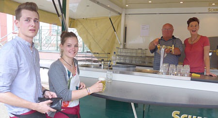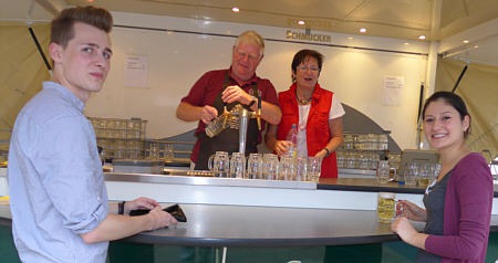 Im Bierwagen übernehmen Ingeborg und Dieter den Zapfhahn während Tim und Acelya bedienen.