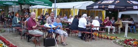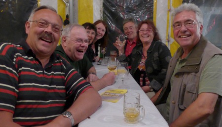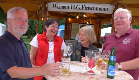 Manfred und Adolf beim Schoppen am Weinstand von H. G. Fleischmann.