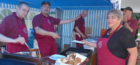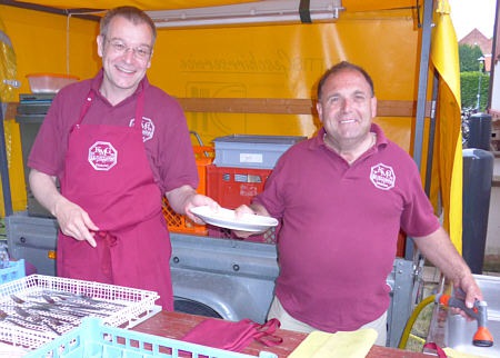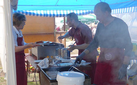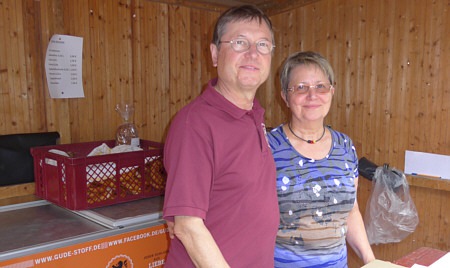 Im Grillstand brutzeln Heinz-Werner und Albert und Edith bedient die hungrigen Gäste.