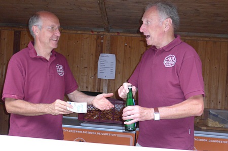 Im Marktstand für Alkoholfreies übernimmt Gerhard die Bedienung. Bernhard kontrolliert schon mal die Geldkassette.