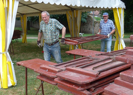 Ab 8:00 Uhr ist die Abbaumannschaft zugange. Die Festzeltgarnituren müssen zuerst aus dem Zelt der Sängerlust abgebaut werden, dann folgen die anderen Garnituren. Paul und Adolf sind dran. Es folgt der Abtransport der Garnituren. Leider waren die Fahrzeuge von Albert und Gundolf ausgefallen, so musste improvisiert werden. Nach dem Abtransport der Garnituren mussten die Zelte ausgeräumt werden; erst dann konnten die Zelte abgebaut werden. Eine Gewitterboe hatte ein Doppelzelt in der Nacht zerknickt.