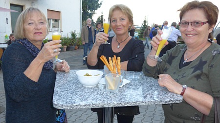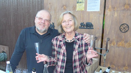 Am Tor der Reiterhalle kredenzen Peter, Brigitte, Marion und Hildegard den Jubiläumssekt.