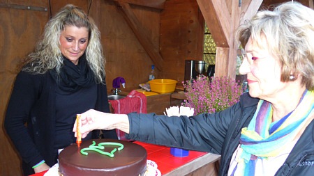 Kerstin am Getränkestand und Renate dekorieren die Geburtstagstorte.