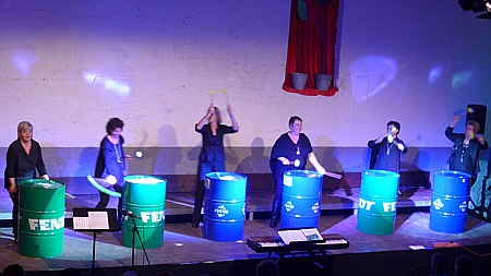 Es geht los, an der Trommel Gabi, Antje, Angelika, Hildegard, Monika und Stephanie.