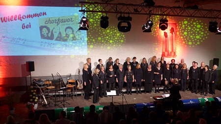 Per Beamer wird zum Willkommen das chorfavor-Logo eingeblendet.