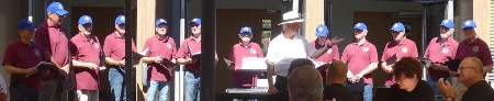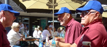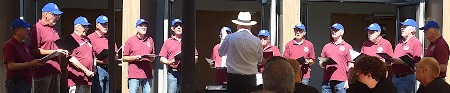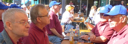 Wir treten heute mit der blauen Schirmmütze auf, denn aus der Erfahrung vom Auftritt 2023 ist es günstig, wenn die Augen beim Auftritt beschattet sind und nicht von der Sonne geblendet.