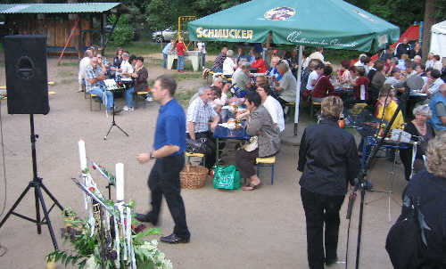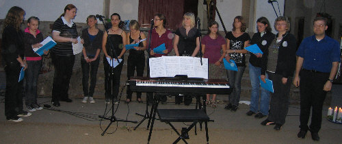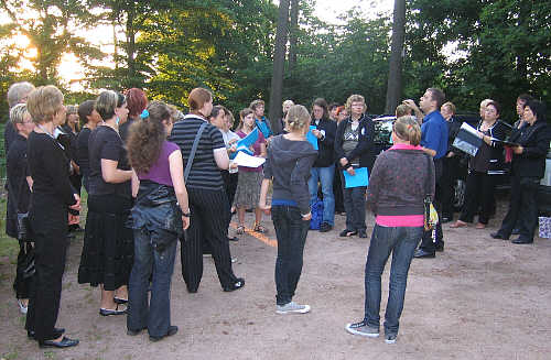 Einsingen vor dem Auftritt auf der Moret, die Sonne scheint noch durch die Bäume, Sonnenuntergang ist laut Kalender erst um 21:41 Uhr. |