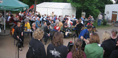 Blick von der Auftrittstreppe linker Hand ins Publikum vor Konzertbeginn, es sind schon allle Plätze besetzt. Später wurden noch Sitzgelegenheiten hinzugestellt. |