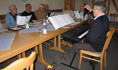 Obwohl Orkan Emma am Samstag morgen mit seiner Sturm- und Gewitterfront über Dieburg und den Odenwald zog, waren doch 28 Sänger zum Chorwochenende angereist. In Bad König-Zell trat die Mümling über die Ufer und einige Bäume waren vom Sturm umgedrückt worden aber insgesamt kam Zell glimpflich davon. Erstmals waren die Chorproben zusätzlich zum Dirigenten, Ralph Scheiner, noch von Manfred Krämer durchgeführt worden. Die rund 8 Stunden zusätzlicher Chorproben schlugen sich im Probenergebnis nieder. Es war ein Quantensprung gegenüber den vergangenen Chorwochenenden. Die Spaziergänge die früher während der Probenpausen unternommen wurden, wurden von den Sängern nicht vermißt, im Gegenteil, die Gesangsproben machten viel Spaß, denn der Lernerfolg stellte sich schneller als gewohnt ein. Das geprobte Repertoir: |