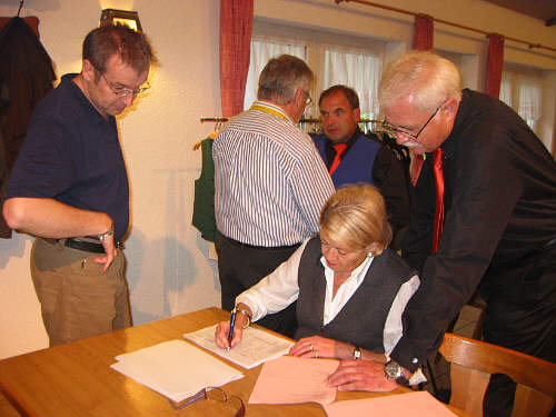 Hier wird die Wandergruppe fotografiert. Da gleichzeitig auch noch der Ausschuss zur Vorbereitung des Stiftungsfests im Schankraum tagte, ging es an diesem Mitwoch sehr turbulent zu und hinter der Theke hatte Helmut Hiemenz alle Hände voll zu tun beim Bierzapfen und Brötchen zubereiten. |