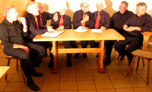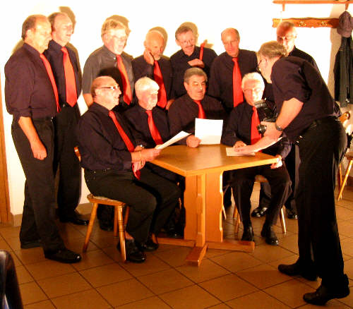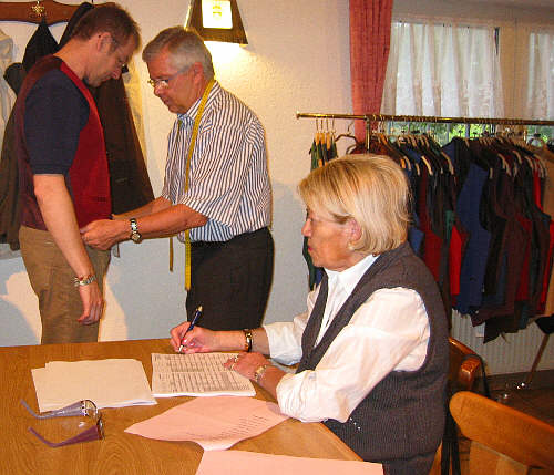 Am 3.9. hatte sich der Schneider, Hr. Schuck, aus Leidersbach zum Ausmessen der neuen Westen für die Männersänger angesagt. Gleichzeitig wurde der Abend zum Fotografieren der Männersänger, stimmenweise, also Tenöre und Bässe, sowie der Wandergruppe genutzt. |