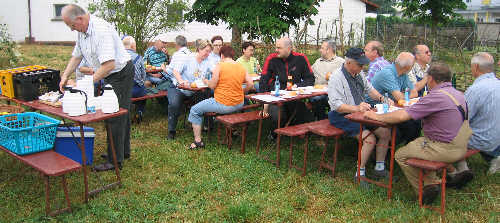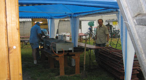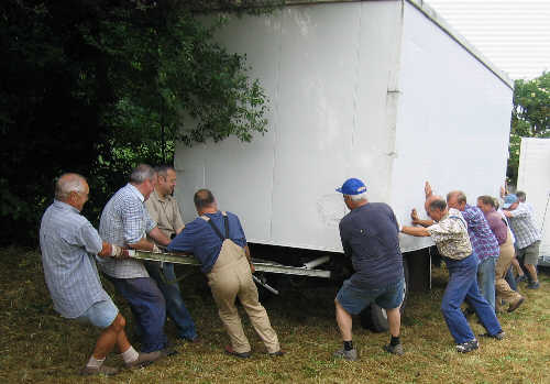 Der Bauwagen wird ausgeladen. Die Plazierung der Zelte und Festzeltgarnituren war nur grob skiziertt, so mussten noch viele Details besprochen werden. |