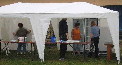 Trotz Gewitterregen geht die Einrichtung des Salat- und Kuchenzeltes weiter. |
