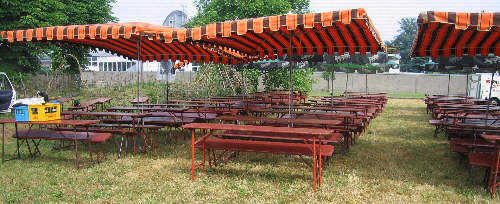 Drei Reihen Festzeltgarnituren, überspannt mit Sonnenschirmen, stehen für die Gäste bereit. |
