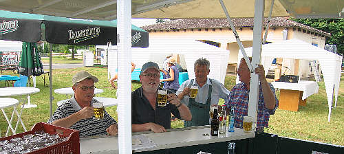 Auch bei dem lang anhaltenden Gewitterregen bleibt die Stimmung bestens, dezimiert jedoch die Bierbestände. |
