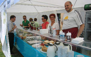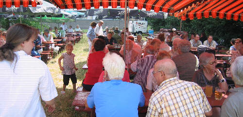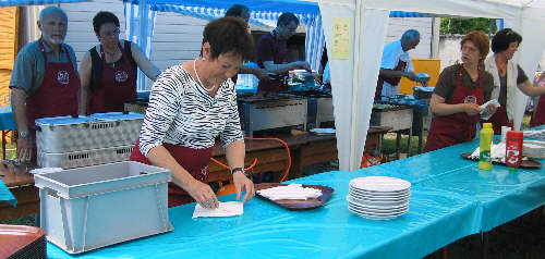Bereits um 7:00 Uhr löst Monika die Nachtwache durch den Schäferhundeverein ab und die Vorbereitungen in der Salat- und Kuchenküche, Grillküche, Spülmobil, Getränkestand, Bierstand usw. beginnen für die Bewirtung der Gäste. Die Sonnenschirme werden entfaltet, die Tische und Bänke gesäubert, der Altar geschmückt usw. |